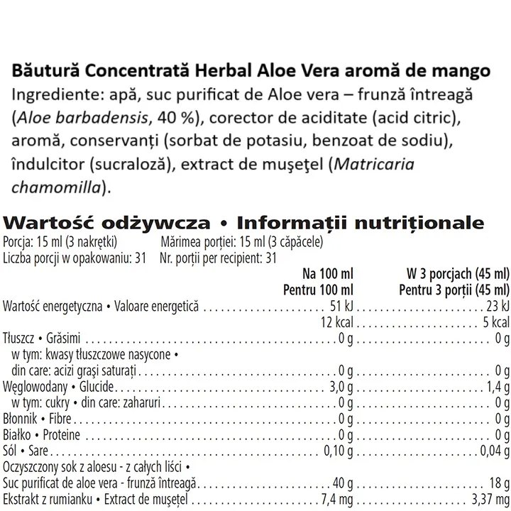 Herbal Aloe Concentrate Mango este o băutură concentrată pe bază de Aloe vera, creată pentru a fi diluată în apă și savurată ca o băutură răcoritoare, naturală și ușoară. Formula este inspirată din proprietățile tradiționale ale plantei Aloe vera, folosită de mii de ani pentru suport digestiv, hidratare și echilibru interior.