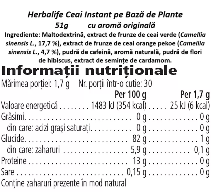Ceaiul Herbalife conține ceai verde și ceai negru Orange Pekoe, cu compuși bioactivi care sprijină controlul apetitului. Cafeina naturală și polifenolii contribuie la senzația de sațietate și reduc dorința de gustări dulci între mese, fiind util pentru persoanele aflate în deficit caloric.