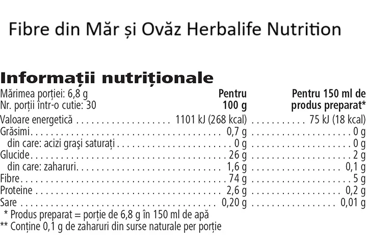 Fibrele Herbalife cu măr și ovăz reprezintă un supliment alimentar premium creat pentru a susține sănătatea sistemului digestiv, echilibrul greutății corporale și detoxifierea naturală a organismului. Cu o combinație exclusivă de fibre solubile și insolubile din 6 surse vegetale (măr, ovăz, porumb, citrice, cicoare și soia), acest produs Herbalife oferă o băutură delicioasă cu aromă naturală de măr, fără zahăr adăugat și fără îndulcitori artificiali.