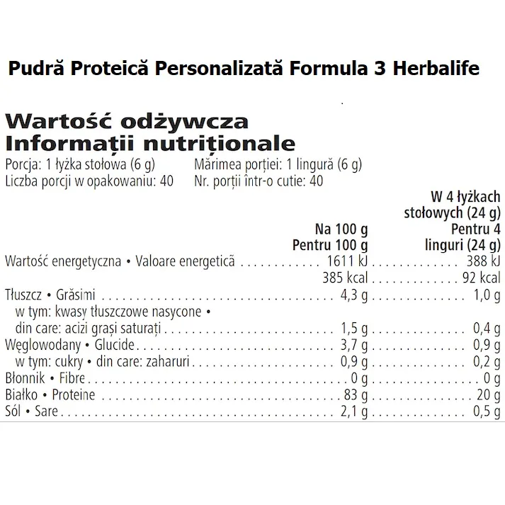 Pudra Proteică Personalizată Formula 3 Herbalife adaugata în Shake Formula 1 Herbalife este soluția ideală pentru persoanele care doresc să își optimizeze aportul proteic, să dezvolte masa musculară, să își mențină sănătatea oaselor și să controleze greutatea. Prin combinarea proteinelor din zer și soia, procesarea avansată și gustul neutru, această pudră proteică devine un aliat esențial în rutina zilnică de nutriție și fitness.