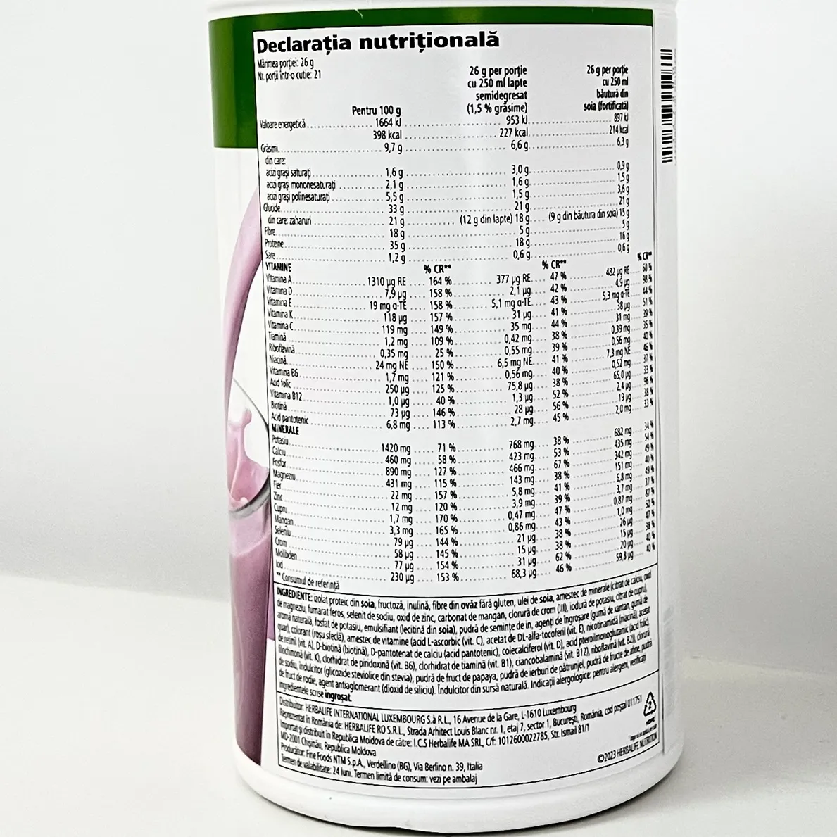 Ingrediente: Izolat proteic din soia, fructoză, inulină, fibre din ovăz fără gluten, ulei de soia, amestec de minerale (citrat de calciu, oxid de magneziu, fumarat feros, selenit de sodiu, oxid de zinc, carbonat de mangan, clorură de crom (III), iodură de potasiu, citrat de cupru), fosfat de potasiu, emulsifiant (lecitină din soia), pudră de semințe de in, agenți de îngroșare (gumă de xantan, gumă de guar), aromă naturală, colorant (roșu sfeclă), amestec de vitamine (acid L-ascorbic (vit. C), acetat de DL-alfa-tocoferil (vit. E), nicotinamidă (niacină), acetat de retinil (vit. A), D-biotină (biotină), D-pantotenat de calciu (acid pantotenic), colecalciferol (vit. D), acid pteroilmonoglutamic (acid folic), filochinonă (vit. K), clorhidrat de piridoxină (vit. B6), clorhidrat de tiamină (vit. B1), ciancobalamină (vit. B12), riboflavină (vit. B2)), clorură de sodiu, îndulcitor (glicozide steviolice din Stevia), pudră de fruct de papaya, pudră de ierburi de pătrunjel, pudră de fructe de afine, pudră de fruct de rodie, agent antiaglomerant (dioxid de siliciu).