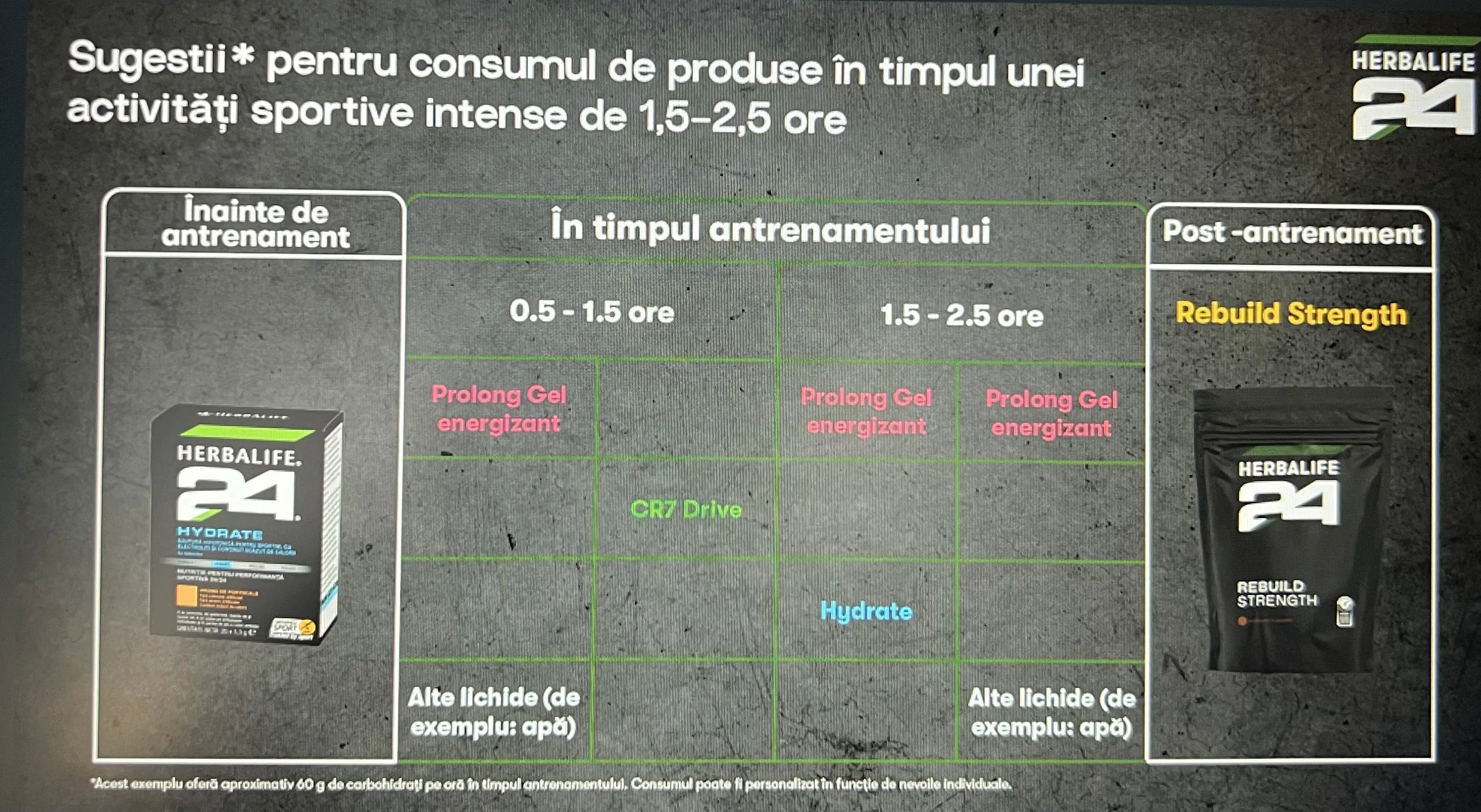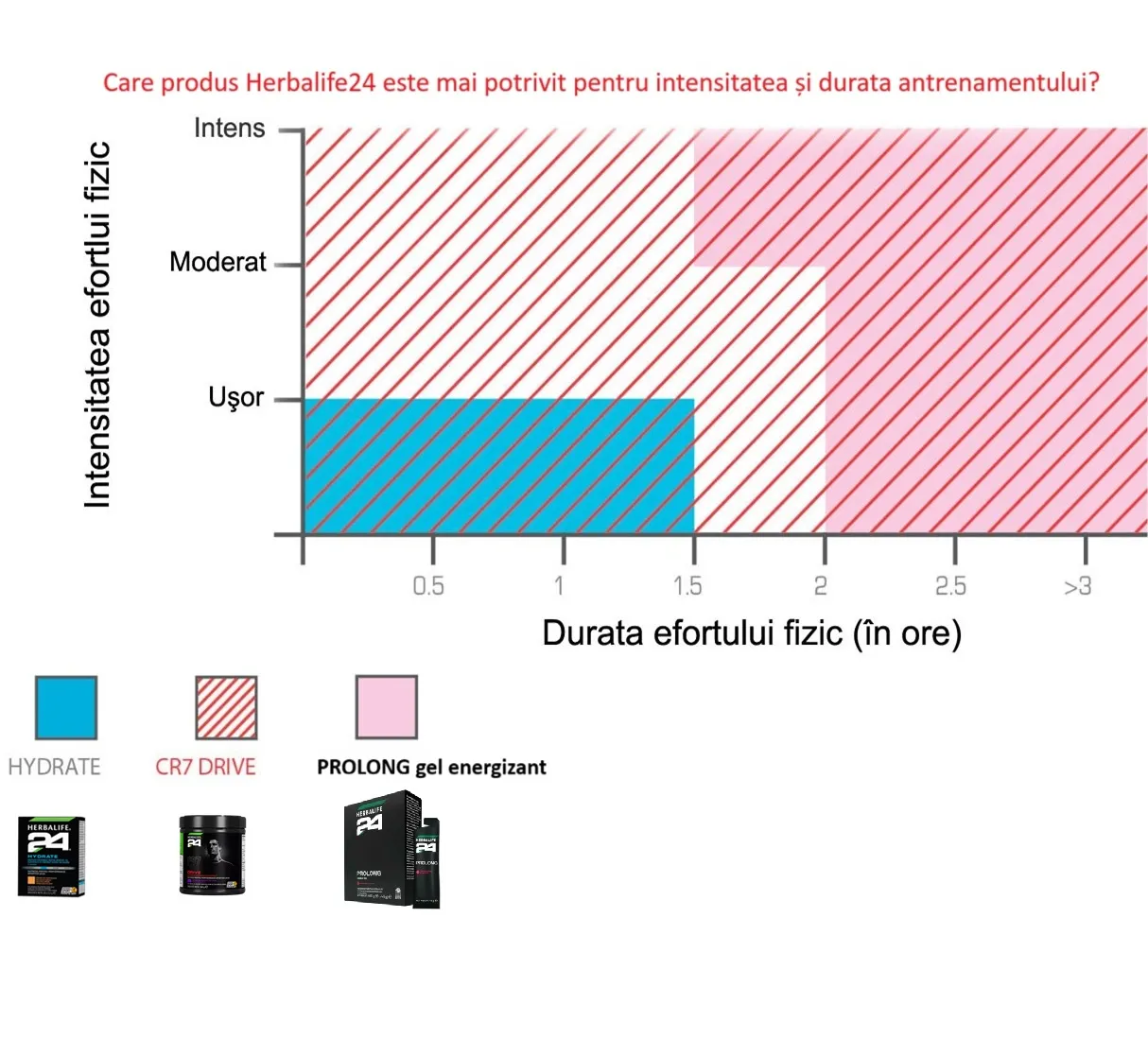 | Herbalife24® CR7 Drive (izotonică) | Hidratează rapid și furnizează carbohidrați + electroliți pentru sporturi de anduranță. |