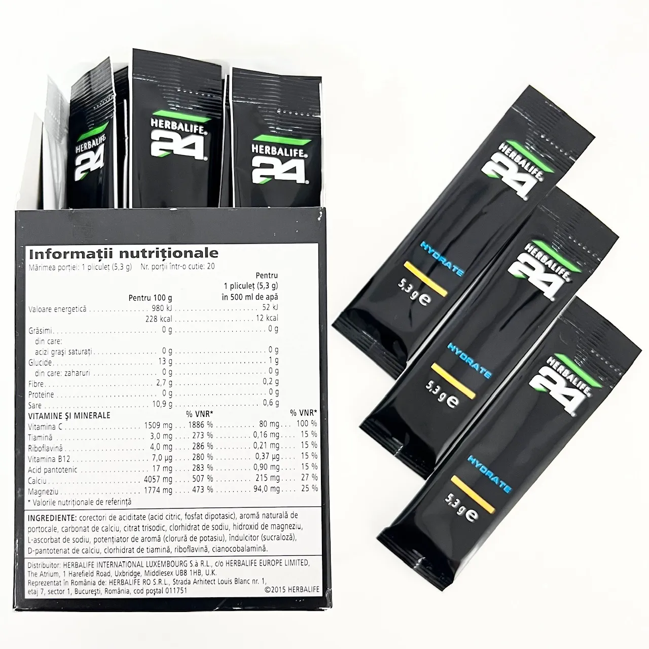 Herbalife24® Hydrate este o băutură pentru sportivi, cu electroliți și vitamina C, săracă în calorii. Este recomandată pentru activități fizice de intensitate ușoară, cu o durată de până la 90 de minute. Hydrate contribuie la menținerea echilibrului electrolitic, susținând hidratarea optimă și reducând senzația de oboseală.