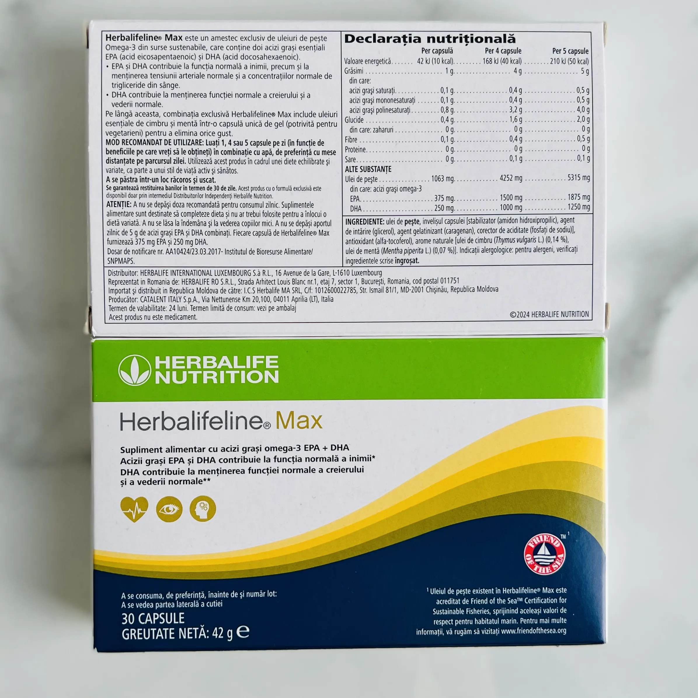 Dacă ai căutat Herbalife Omega 3 cu livrare rapidă prin curier, Herbalifeline capsule sau Herbalifeline Max, pentru suport cardiovascular și metabolic mai intens, ești în locul potrivit. Acest supliment Herbalife cu formula actualizată combină EPA și DHA de înaltă puritate pentru a livra rezultate în cadrul unei diete echilibrate și variate, integrate într-un stil de viață activ. În plus, contribuie elegant la un program strategic de slăbire cu Omega-3 atunci când este asociat cu aport caloric controlat, hidratare, somn adecvat și mișcare regulată.