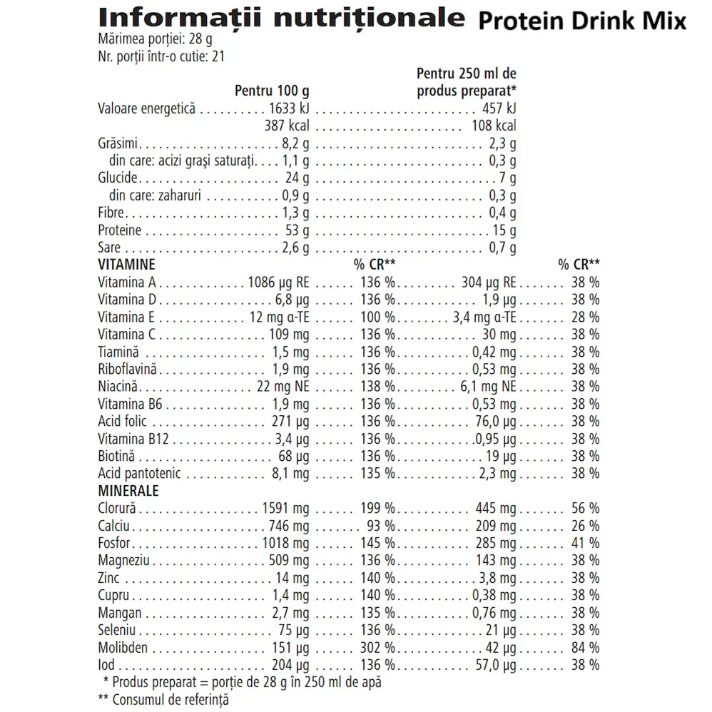 Ca gustare proteică: amestecă 2 măsuri (28 g) de Protein Drink Mix cu 250 ml apă rece sau 3 măsuri (42 g) cu 375 ml apă rece, în funcție de necesarul proteic zilnic.