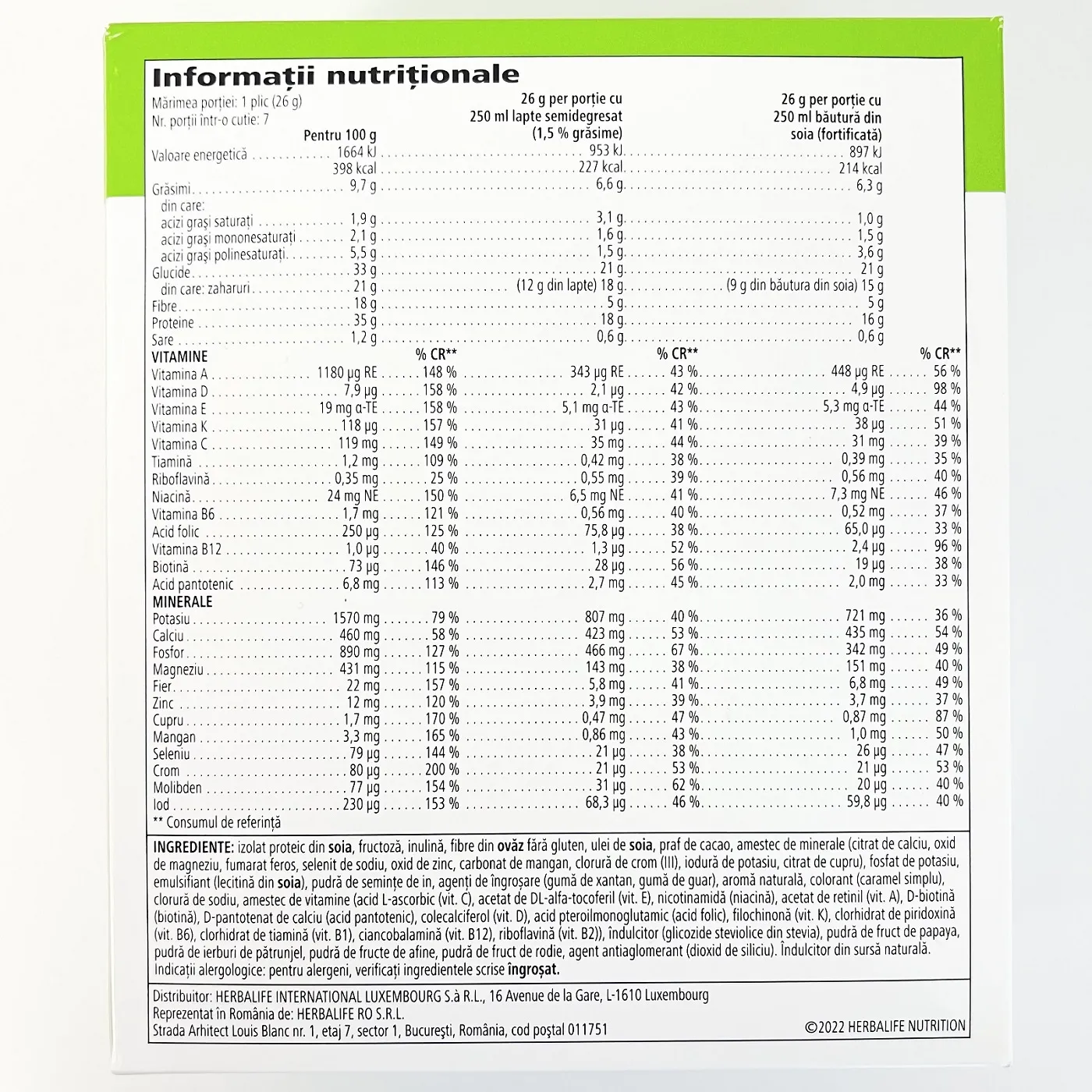 Informații despre alergeni: CONȚINE SOIA ȘI OVĂZ.