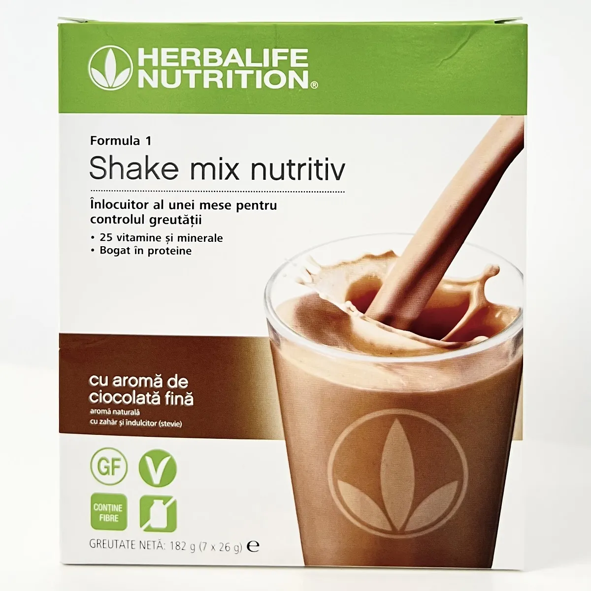 Ingrediente Formula 1 Herbalife: Izolat proteic din soia, fructoză, inulină, fibre din ovăz fără gluten, ulei de soia, praf de cacao, amestec de minerale (citrat de calciu, oxid de magneziu, fumarat feros, selenit de sodiu, oxid de zinc, carbonat de mangan, clorură de crom (III), iodură de potasiu, citrat de cupru), fosfat de potasiu, emulsifiant (lecitină din soia), pudră de semințe de in, agenți de îngroșare (gumă de xantan, gumă de guar), aromă naturală, colorant (caramel simplu), clorură de sodiu, amestec de vitamine (acid L-ascorbic (vit. C), acetat de DL-alfa-tocoferil (vit. E), nicotinamidă (niacină), acetat de retinil (vit. A), D-biotină (biotină), D-pantotenat de calciu (acid pantotenic), colecalciferol (vit. D), acid pteroilmonoglutamic (acid folic), filochinonă (vit. K), clorhidrat de piridoxină (vit. B6), clorhidrat de tiamină (vit. B1), ciancobalamină (vit. B12), riboflavină (vit. B2)), îndulcitor (glicozide derivate din steviol), pudră de fruct de papaya, pudră de ierburi de pătrunjel, pudră de fructe de afine, pudră de fruct de rodie, agent antiaglomerant (dioxid de siliciu). Îndulcitor din sursă naturală.